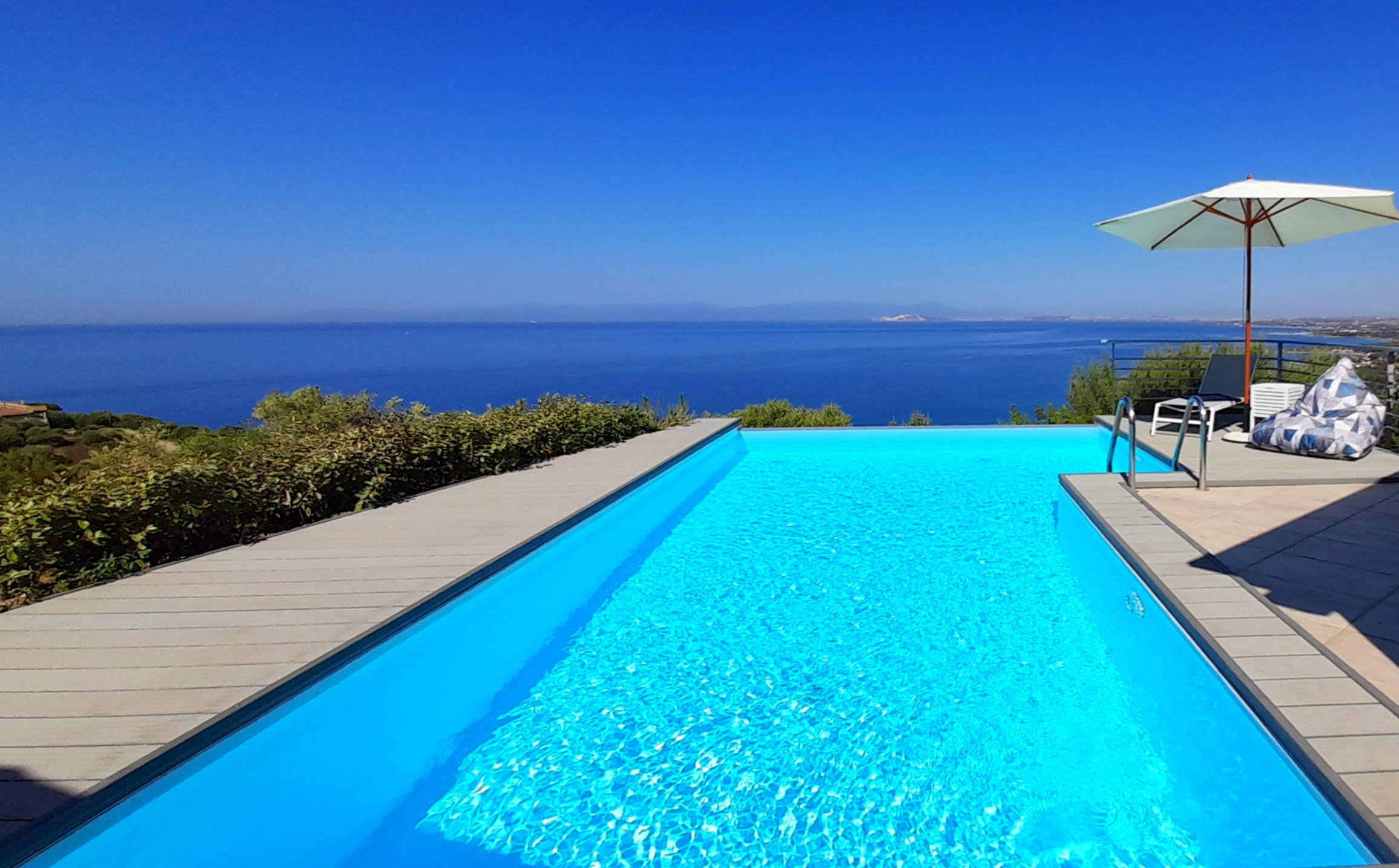 This splendid villa with private parking for two cars covers an area of 120m2 with a further 80m2 of terras / decking surrounding the stunning infinity pool, an outdoor BBQ accompanies seating areas by the pool, for dining or just relaxing in the sun or shade in total privacy, this is all set in lush gardens, the villa can comfortably accommodate 8 people in 4 bedrooms on the lower floor, 3 of which have sea views, there are 2 fully fitted bathrooms consisting of shower, toilet and bidet with a separate area for the wash basin and mirror, the upper floor consists of a very spacious living room with panoramic triple aspect views and access through french doors to the pool and al fresco dining area, there is a fully equipped kitchen with a breakfast counter and direct access to a small balcony for that morning coffee, The kitchen is fully equipped with coffee makers, kettle, oven, microwave, dishwasher, fridge, freezer, fire extinguisher, first aid kit and all required cooking utensils, all rooms have air conditioning and satellite WiFi, you will be presented with a welcome basket on your arrival, guests also have access to the stunning community pool located 50m directly behind the villa and accessible via the rear gate. We would recommend that guests rent a car during thier stay as walking in the local terrain can be challenging.